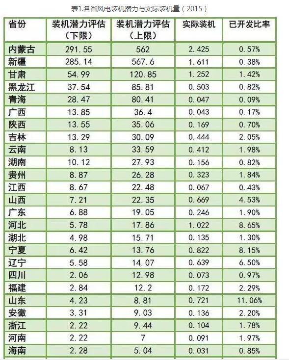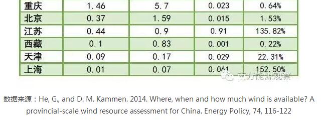 是什么原因造成了我國風(fēng)電發(fā)展區(qū)域間的不平衡?最為常見的解釋是風(fēng)力資源分布的不平衡造成的。我國風(fēng)電資源豐富,潛在可利用風(fēng)能超過5500GW(中國氣象局,2014),但區(qū)域分布非常不均衡。政府和學(xué)術(shù)界都對我國風(fēng)力資源以及風(fēng)電開發(fā)潛力進(jìn)行過研究,這里我引用He and Kammen(2014)對我國各省風(fēng)電裝機(jī)潛力的估計(jì)結(jié)果,如表1所示??梢钥闯?,省級層面風(fēng)電開發(fā)潛力差異巨大,從少于1GW到超過600GW,并且中國北部(內(nèi)蒙古,黑龍江,吉林,遼寧)和部分西部(西藏,新疆,青海,甘肅)的廣大地區(qū)風(fēng)能尤其豐富。但是,地區(qū)之間風(fēng)能分布的差異并不能很好地解釋風(fēng)能發(fā)展的巨大地區(qū)差異,風(fēng)能資源利用率從不足1%到超過100%。即使在風(fēng)力資源潛力比較相似的省份,實(shí)際裝機(jī)容量差異也可能很大。