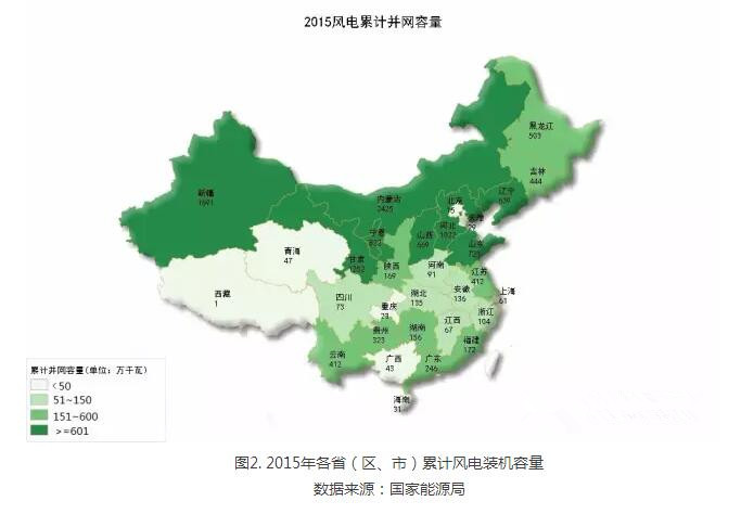 與全國風(fēng)電裝機(jī)總量快速增加相伴的另一個(gè)現(xiàn)象是風(fēng)電發(fā)展嚴(yán)重的區(qū)域不平衡。雖然從2010年以來幾乎所有的省份都有風(fēng)電裝機(jī),但裝機(jī)集中在風(fēng)能資源豐富的三北地區(qū)(華北、東北和西北)。 圖2為我國2015年累計(jì)風(fēng)電裝機(jī)并網(wǎng)容量的省域分布?!叭薄卑耸》荩▋?nèi)蒙古,新疆,河北,甘肅,寧夏和東北三?。├塾?jì)裝機(jī)量占全國總?cè)萘康娜种陨稀?