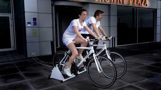 在丹麥哥本哈根的一家名叫Crown Plaza的旅館里,有一個(gè)特別有創(chuàng)意的發(fā)電裝置。該旅館讓它的客人們來(lái)騎健身腳踏車,這樣既可鍛煉身體,又可以發(fā)電。同時(shí),這些客人就可以免費(fèi)獲得一頓飯作為回報(bào)。客人們只需要騎上15分鐘,就能發(fā)出10瓦時(shí)的電。然后,便能獲得價(jià)值36美元一頓飯了。其發(fā)出的電可以維持一臺(tái)筆記本電腦工作約30分鐘。并且,這個(gè)創(chuàng)新很容易實(shí)行,一個(gè)便可以完成。