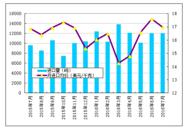 圖3 2015年7月-2016年7月多晶硅進口量及進口均價示意圖 數(shù)據(jù)來源:海關