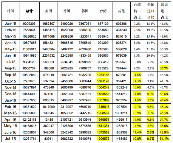 根據(jù)海關最新數(shù)據(jù)統(tǒng)計,2016年7月份我國多晶硅進口量依舊維持在萬噸以上,達到12082噸,環(huán)比增加0.22%,同比大幅增加25.0%。2016年截止7月份,七個月單月進口量均在萬噸以上,其中有五個月單月進口量都超過1.2萬噸,1-7月份累計進口多晶硅83016噸,同比增加19.0%。導致多晶硅進口量持續(xù)維持在萬噸以上的原因主要是:第一,從韓國進口量居高不下。7月份從韓國進口量達到6540噸,環(huán)比增加23.5%,同比大幅增加48.7%,比前七個月月均進口量高出13.4%,僅次于4月份的歷史最高位6614噸,占到7月份總進口量的54.1%,一半以上的進口量來自韓國進口,主要是因為中國對韓國多晶硅反傾銷裁決只是象征性的2.4-2.8%稅率。第二,從臺灣進口多晶硅占比維持高位。7月份從臺灣進口多晶硅為1307噸,占進口總量的10.8%?!皶和<庸べQ(mào)易措施”嚴格執(zhí)行的9月份開始,從臺灣進口多晶硅量驟然增加至千噸以上,占比達到10%以上,成為我國除韓國和德國外的第三大進口地區(qū)一直持續(xù)至今,尤其是4月份從臺灣進口量達到1941噸,創(chuàng)歷史新高,占總進口量的16.0%。臺灣地區(qū)不生產(chǎn)多晶硅,主要是受“雙反”影響的美國多晶硅通過臺灣規(guī)避。第三,其他地區(qū)月進口量日漸增加。7月份從韓、臺、德、美以外的地區(qū)進口量達到1468噸,來自日本、馬來西亞、挪威以及沙特的進口量均在200噸以上,尤其是從馬來西亞進口量7月份達到796噸,占總進口量的6.6%。綜上,自韓國、臺灣進口量長期維持高位,其他地區(qū)進口量日漸增加是導致總進口量居高不下的主要因素。