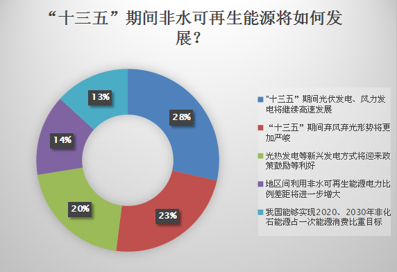 “十三五”期間,非水可再生能源究竟會怎樣發(fā)展?日前,中國電力新聞網(wǎng)以及中電傳媒微博、微信、論壇發(fā)起關(guān)于“十三五”期間非水可再生能源將如何發(fā)展”的話題征集活動,調(diào)查結(jié)果如下:28%的受訪者認為,“十三五”期間光伏發(fā)電、風(fēng)力發(fā)電將繼續(xù)高速發(fā)展;23%的受訪者認為,“十三五”期間棄風(fēng)棄光形勢將更加嚴峻;20%的受訪者認為,光熱發(fā)電等新興發(fā)電方式將迎來政策鼓勵等利好;14%網(wǎng)友的受訪者認為,地區(qū)間利用非水可再生能源電力比例差距將進一步增大;13%的受訪者認為,我國能夠?qū)崿F(xiàn)2020、2030年非化石能源占一次能源消費比重目標。