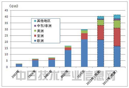 圖1:全球太陽能電池板出貨量走勢。預(yù)計(jì)2013年歐洲將大幅減少,但亞洲和美洲會(huì)增加。本圖是2012年5月發(fā)表的數(shù)據(jù),因此2012年也為預(yù)測值。是根據(jù)政策促進(jìn)情況分析出的需求增加(出處:歐洲光伏發(fā)電協(xié)會(huì)(EPIA))