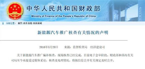5月28日,財政部官網(wǎng)表示關(guān)于新能源汽車推廣騙補的現(xiàn)場核查已經(jīng)完成,進(jìn)入會審階段。