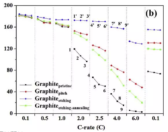 電化學測試表明,經(jīng)過常溫KOH處理的石墨材料相比于未經(jīng)處理的石墨材料具有更好的倍率性能,在2.5C的充電倍率下,循環(huán)100次容量保持率達到96.7%,而未經(jīng)處理的石墨材料容量保持率僅為50%左右,從0.1C到6C充電倍率的測試結(jié)果表明,經(jīng)過KOH腐蝕處理的石墨材料倍率性能較沒有處理過的石墨材料有了顯著的提升,特別是在充電倍率高于2C時,優(yōu)勢十分明顯。