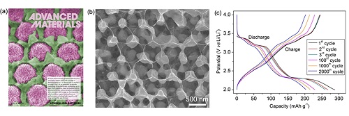圖:(a)三維石墨烯/五氧化二釩正極材料的SEM截面圖(Advanced Materials的卷首插畫); (b)三維石墨烯的SEM照片; (c)充放電循環(huán)曲線(5C, 2000次)