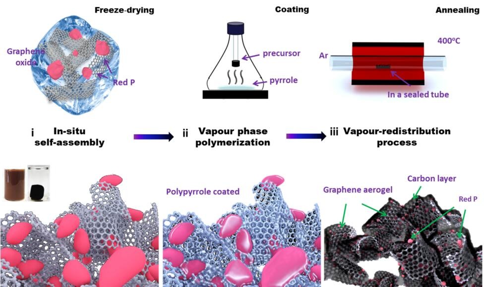 針對上述問題,澳大利亞伍倫貢大學(University of Wollongong, UOW)郭再萍(Zaiping Guo)教授和陳俊(Jun Chen)副教授課題組提出了一種新型的氣化重組技術(shù),制備出碳/紅磷/石墨烯氣凝膠三維多孔復合材料。