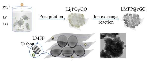 近日,四川大學(xué)的Wei Xiang等通過(guò)前向法合成了石墨烯包覆磷酸鐵錳鋰材料。他們首先利用共沉淀法在氧化石墨烯溶液中合成了氧化石墨烯包覆納米Li3PO4材料,然后利用溶劑熱法,在乙二醇溶液中使該前驅(qū)體與Mn2+和Fe2+反應(yīng),獲得LiMn0.5Fe0.5PO4材料,然后氧化石墨烯被還原成為石墨烯,該材料繼承了前驅(qū)體Li3PO3的形貌,其顆粒直徑僅有20nm左右,極大的縮短了Li+的擴(kuò)散距離,石墨烯網(wǎng)絡(luò)結(jié)構(gòu)賦予了該材料良好的導(dǎo)電性能。