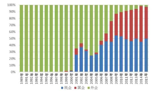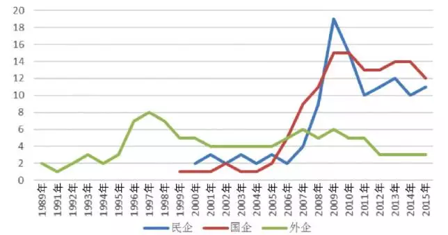 中國(guó)風(fēng)電整機(jī)制造企業(yè)累計(jì)共有73家,外企21家,民企26家,國(guó)企20家,這些企業(yè)在風(fēng)電發(fā)展的三十年間陸陸續(xù)續(xù)有進(jìn)有退,直到2015年,外企3家,國(guó)企12家,民企11家。從風(fēng)電制造企業(yè)個(gè)數(shù)變化看,上世紀(jì)九十年代,外資企業(yè)獨(dú)占中國(guó)市場(chǎng),起初只有2家至3家進(jìn)入中國(guó)市場(chǎng),1997年達(dá)到最多,出現(xiàn)8家,隨后又減少到5家左右;隨著風(fēng)電技術(shù)的引進(jìn),中國(guó)制造企業(yè)起步于本世紀(jì)初,2000年還不到五家,2005年起開(kāi)始增長(zhǎng),2009年達(dá)到最多,當(dāng)年企業(yè)數(shù)量為34家(民企19家,國(guó)企15家),2011年又一度減退到23家(民企10家,國(guó)企13家)?!笆濉逼陂g,無(wú)論是外資企業(yè)還是中國(guó)企業(yè),較之前都有明顯的減少,近兩年維持穩(wěn)定在25家左右。