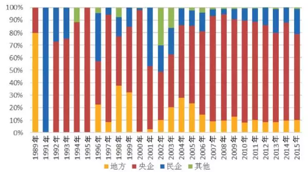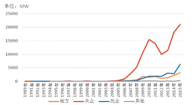 從歷年新增裝機(jī)的市場(chǎng)占有率看,從2005年到2015年,國(guó)企的市場(chǎng)占有率均超過(guò)80%,在2008年最高達(dá)到95%,之后又回落在80%至90%之間,其中,央企的市場(chǎng)占有率達(dá)到70%至80%之間,而地方國(guó)企僅占10%左右。從2009年至2015年,民企市場(chǎng)占有率整體趨勢(shì)顯示增強(qiáng),尤其在2013年和2014年,民企市場(chǎng)占有率達(dá)到20%左右。