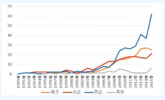 風電開發(fā)企業(yè)主要為中國企業(yè),外商投資企業(yè)進入中國市場非常有限。在國企中,主要分布有中央直屬企業(yè)和地方國企。從風電開發(fā)企業(yè)數(shù)量變化看,2004年以前,不足10家企業(yè),從2005年起逐年增長,到2013年超過80家,其中央企17家,地方國企26家,民企41家(國企和民企均超過40家,在此期間,國企的數(shù)量一直比民企多);到2015年,企業(yè)數(shù)量共計超過100家企業(yè),民企數(shù)量突破60家,超過國企,央企和地方國企數(shù)量與2013年相比變化不大。