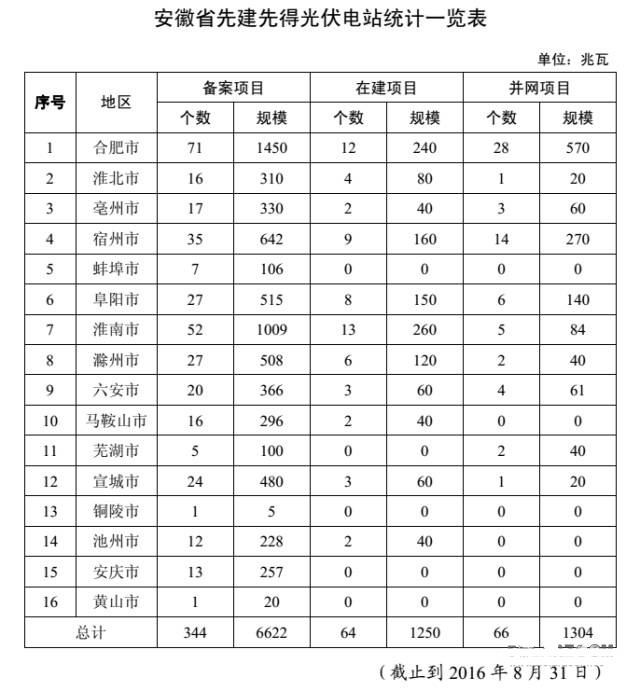 初步統(tǒng)計,截止 2016 年 8 月底,全省已備案 20 兆瓦及以下 先建先得光伏電站項目 344 個,裝機 6622 兆瓦。其中,并網(wǎng)項 目 66 個,裝機 1304 兆瓦,占全省并網(wǎng)光伏電站裝機 54%;在建項目 64 個、裝機 1250 兆瓦。并網(wǎng)項目中,有 53 個項目、裝機 1024 兆瓦確認(rèn)了光伏電站規(guī)模指標(biāo),約占已建成并網(wǎng)裝機規(guī)模的 80%。
