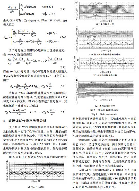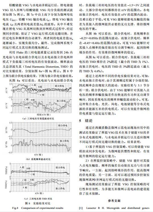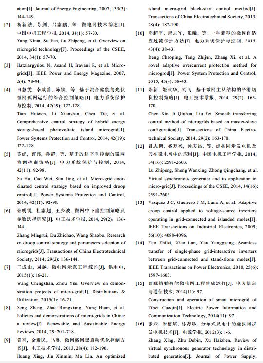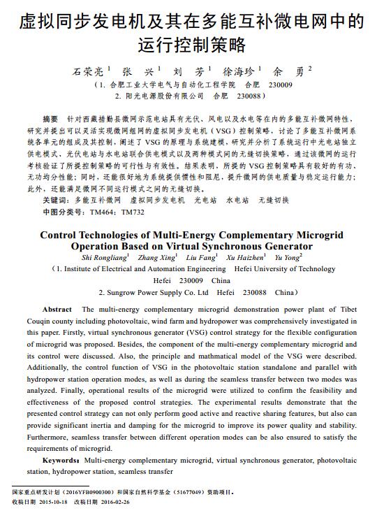 摘要:針對西藏措勤縣微電網(wǎng)示范電站具有光伏、風(fēng)電以及水電等在內(nèi)的多能互補微電網(wǎng)特性,研究并提出可以靈活實現(xiàn)微電網(wǎng)組網(wǎng)的虛擬同步發(fā)電機(VSG)控制策略,討論了多能互補微電網(wǎng)系統(tǒng)各單元的組成及其控制,闡述了VSG的原理與系統(tǒng)建模,研究并分析了系統(tǒng)運行中光電站獨立供電模式、光伏電站與水電站聯(lián)合供電模式以及兩種模式間的無縫切換策略,通過該微電網(wǎng)的運行考核驗證了所提控制策略的可行性與有效性。結(jié)果表明,所提的VSG控制策略具有較好的有功、無功均分性能;同時,還能很好地為系統(tǒng)提供慣性和阻尼,提升微電網(wǎng)的供電質(zhì)量與穩(wěn)定運行能力;此外,還能滿足微電網(wǎng)不同運行模式之間的無縫切換。