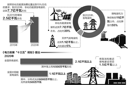 在電源結(jié)構(gòu)方面。按照非化石能源消費比重達到15%左右的要求,到2020年,非化石能源發(fā)電裝機達到7.7億千瓦左右,比2015年增加2.5億千瓦左右,占比約39%,提高4個百分點,發(fā)電量占比提高到31%;天然氣發(fā)電裝機增加5000萬千瓦,達到1.1億千瓦以上,占比超過5%;煤電裝機力爭控制在11億千瓦以內(nèi),占比降至約55%。電源結(jié)構(gòu)得到進一步優(yōu)化。