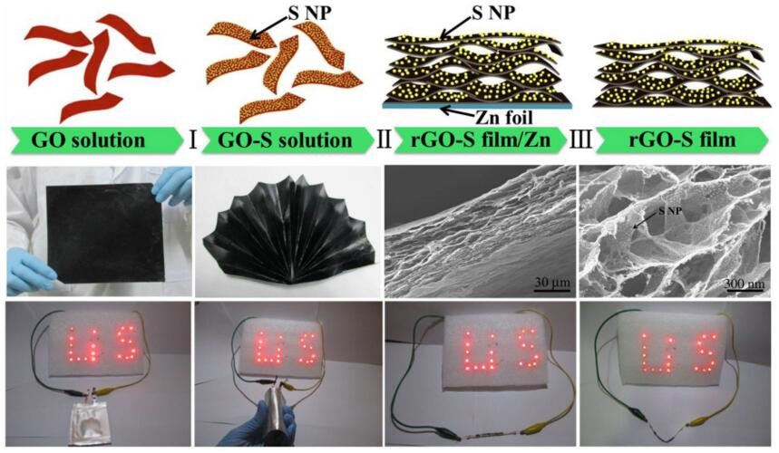 近期,南開大學牛志強研究團隊結(jié)合原位復合和金屬還原自組裝的方法制備了自支撐柔性石墨烯/硫納米復合薄膜,復合物薄膜中石墨烯具有連續(xù)的網(wǎng)絡(luò)狀結(jié)構(gòu),硫均勻分散在石墨烯的表面,石墨烯連續(xù)的網(wǎng)絡(luò)狀結(jié)構(gòu)不僅為離子和電子傳輸提供了有效的途徑,還可以有效吸附多硫化物并抑制其溶解。