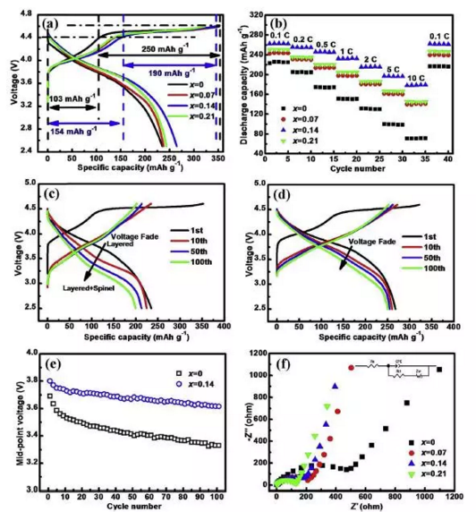 哈爾濱工業(yè)大學(xué)的Quanxin Ma等人針對富鋰材料這些問題進行了摻雜改性實驗。Quanxin Ma通過向富鋰材料中加入Se元素合成了Li1.2[Mn0.7Ni0.2Co0.1]0.8_xSexO2,實驗表明該材料具有良好的倍率性能,在10C的倍率下,比容量可達178mAh/g,并且Se元素?fù)诫s很好的抑制了富鋰材料的電壓衰降,循環(huán)100次,中值電壓衰降僅為5%。