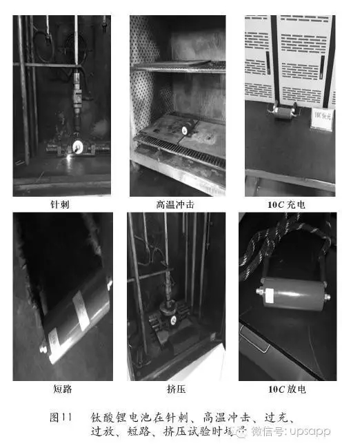 使用安全。鈦酸鋰電池在短路、過充、過放、擠壓、針刺、跌落、高溫沖擊、加熱的條件下是非常安全的,圖11是鈦酸鋰電池在針刺、高溫沖擊、過充、過放、短路、擠壓試驗(yàn)時(shí)的場景;