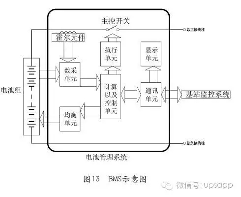 電池管理系統(tǒng)(Battery Management System,BMS)由監(jiān)測、保護(hù)電路、電氣、通訊接口、熱管理和電池組反接保護(hù)裝置等組成,是電池保護(hù)和管理的核心組成部分,不僅要保證電池安全可靠的使用,而且要充分發(fā)揮電池的性能和延長使用壽命,作為通信用的后備能源,BMS在開關(guān)電源和電池之間起到一個(gè)重要橋梁作用。對(duì)BMS的要求必須符合通信電源供電系統(tǒng)的要求,所以BMS的安全管理模式對(duì)電池的安全性至關(guān)重要。BMS主要包括數(shù)據(jù)采集單元、計(jì)算以及控制單元、均衡單元、控制執(zhí)行單元和通訊單元等。圖13為BMS示意圖。
