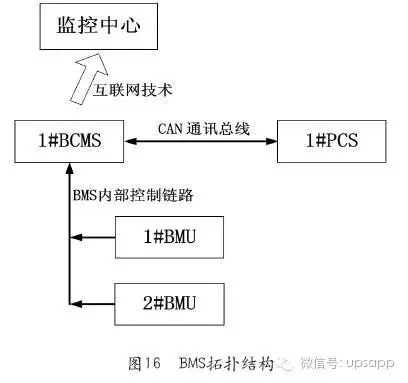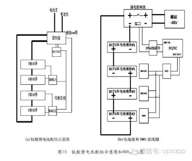 例如,某通信基站使用48V/300Ah鈦酸鋰電池(實(shí)物圖見圖14),每組電池由22只300Ah的電池模塊串聯(lián)組成,其中300Ah的電池是由10個(gè)單電芯容量為30Ah的電芯并聯(lián)組成,22節(jié)300Ah的電池模塊分別有2個(gè)6串和2個(gè)5串模組串聯(lián)組成一個(gè)48V/300AH的電池組,整組電池由BMS系統(tǒng)控制,由一個(gè)BCMS(BatteryClusterManagementSystem,主控電池管理系統(tǒng))負(fù)責(zé)管理一個(gè)電池組中的全部BMU(BatteryManagementUnit,電池組管理單元),同時(shí)具備電池組的電流采集,總電壓采集,漏電檢測功能,并在電池組狀態(tài)發(fā)生異常時(shí)驅(qū)動(dòng)斷開高壓功率接觸器,使電池組退出運(yùn)行,保障電池使用安全。兩個(gè)BMU,每個(gè)BMU負(fù)責(zé)管理12串單體電池模塊。具有電池電壓采集,多點(diǎn)溫度采集,各種保護(hù)和電池組均衡控制等功能。鈦酸鋰電池配組示意圖和BMS接線如圖15所示。
