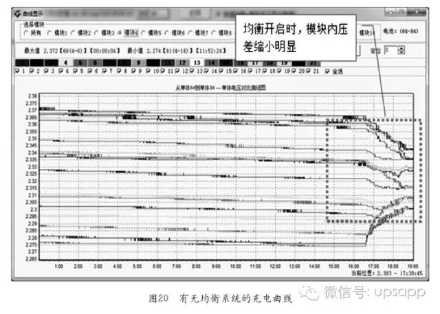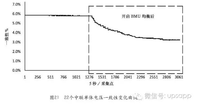 從圖21可以看出300Ah電池組22模組在開啟BMU均衡的時(shí)候,電壓一致性從分散的狀態(tài)逐漸趨于集中,表明單體均衡功能有效。