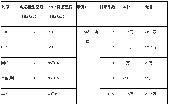 裝載BYD和CATL電池Pack的純電動(dòng)客車,在明年基本上可以拿到1.2倍的補(bǔ)貼系數(shù),以150度電的車型為例,國(guó)補(bǔ)+地補(bǔ)的資金合計(jì)64.8萬,而裝載國(guó)軒和中航鋰電電池Pack的純電動(dòng)客車,補(bǔ)貼資金有54萬,與BYD/CATL存在一定的差距。除了這幾家企業(yè),其他大部分的磷酸鐵鋰電池企業(yè),其Pack的比能量大多在80~95Wh/kg之間,補(bǔ)貼系數(shù)只有0.8,補(bǔ)貼資金只有43.2萬,差距巨大。