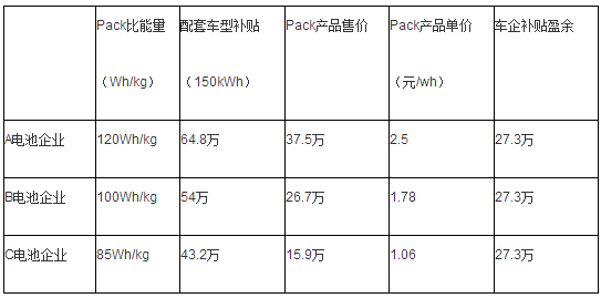 以某車廠的10~12米客車車型為基準(zhǔn),假定電池容量為150kWh,分別選用A,B,C三個(gè)電池廠家的電池pack。A企業(yè)的技術(shù)水平最高,比能量達(dá)到120Wh/kg,產(chǎn)品單價(jià)為2.5元/Wh,產(chǎn)品售價(jià)為37.5萬。車廠可以拿到1.2倍的補(bǔ)貼,扣除電池成本后,補(bǔ)貼盈余為27.3萬。電池廠家B和C的實(shí)力較弱,如要保證車廠達(dá)到同樣的補(bǔ)貼盈余,那么其產(chǎn)品單價(jià)將分別降低到1.78元/Wh和1.06元/wh: