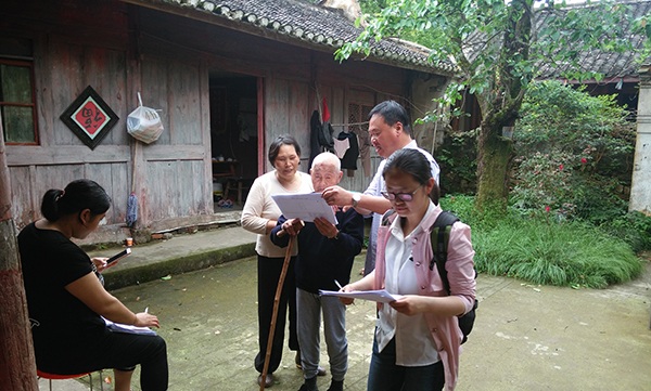 圖為工作人員在挨家挨戶進(jìn)行政策宣講和土地房屋調(diào)查。 周元慶 攝