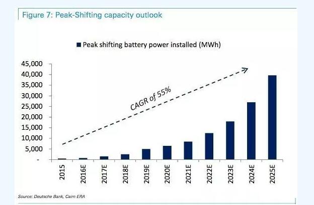 中國儲(chǔ)能網(wǎng)訊:根據(jù)德意志銀行最新發(fā)布的一份研究報(bào)告的分析,全球電池儲(chǔ)能正處于爆發(fā)的關(guān)鍵點(diǎn)。2015年的電池儲(chǔ)能量為70 GWh(7000萬千瓦時(shí)),到2018年將飆升至210GWh(2.1億千瓦時(shí)),而到2025年將進(jìn)一步達(dá)到535GWh(5.35億千瓦時(shí))。