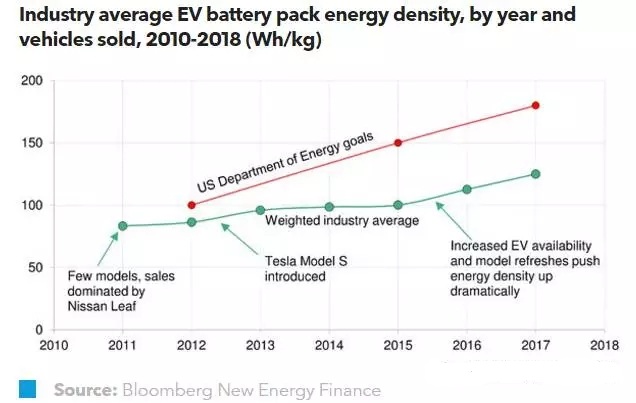 為了與內(nèi)燃機(jī)車型競(jìng)爭(zhēng),電動(dòng)車必須降低電池組成本,并增加續(xù)航里程。2011到2012年間,電動(dòng)車的平均續(xù)航里程基本均在100英里(160公里)以下,電池能量密度一般不到90Wh/kg;而2017款電動(dòng)車的續(xù)航里程則一般可以超過(guò)200英里(320公里),電池密度也達(dá)到了130Wh/kg。