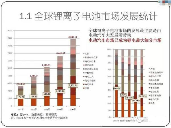 2)自2011年電動汽車商業(yè)化元年以來,在鋰離子電池主要細分市場中,電動汽車用電池市場快速發(fā)展壯大,到2015年用量高達2500萬kWh,市場份額超過28%,成為鋰離子電池最大的細分市場。
