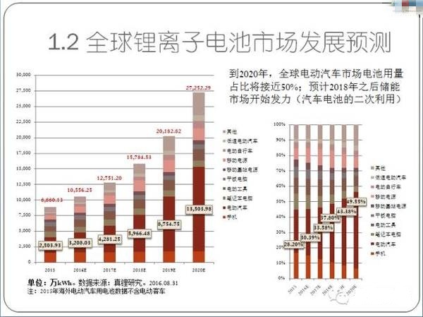 4)預(yù)計到2020年,全球電動汽車市場對鋰離子電池的需求量將高達1.35億kWh,占到整個鋰電總需求的50%左右。鋰離子電池的未來在電動汽車身上,這一點毋庸置疑。