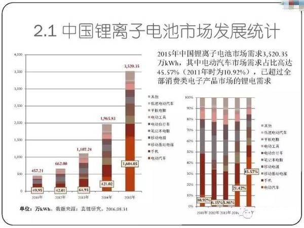 1)中國鋰離子電池市場發(fā)展速度明顯快于全球市場,主要原因是2014年以來電動汽車市場電池需求大爆發(fā),到2015年中國電動汽車市場對鋰離子電池的需求量已經(jīng)高達1600萬kWh,占比超過45%。