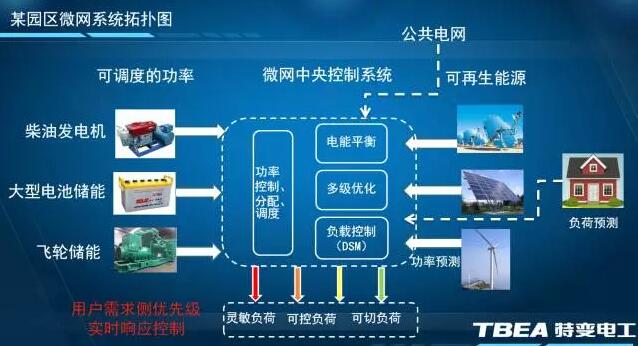 智能微電網(wǎng)是以電力電網(wǎng)110kV變電站為節(jié)點,涵蓋區(qū)域用戶變電站和可再生能源分布式發(fā)電站的智慧能源供電系統(tǒng),建設(shè)在用電需求側(cè),圍繞社區(qū)或者園區(qū)進(jìn)行配置各種可再生能源電力變換與過程建設(shè),讓微電網(wǎng)真正成為國家智能電網(wǎng)的有機(jī)組成部分。通過用電能量管理與微電網(wǎng)協(xié)調(diào)控制實現(xiàn)可再生能源在區(qū)域內(nèi)最大限度的高效利用。