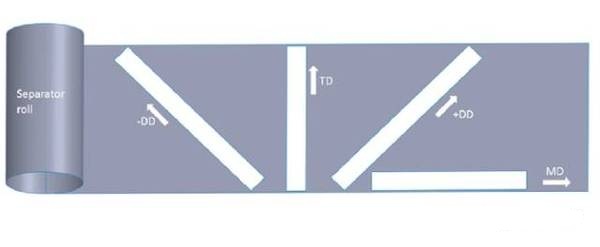 具體實驗過程如下,首先將參與測試的隔膜材料根據(jù)ASTM針對薄膜材料的D882規(guī)范的要求,制成了具有規(guī)則形狀的長條形試樣,拉伸實驗采用Instron 5944單向拉力機(jī)進(jìn)行測試,拉力加載速度為25mm/min。測試結(jié)果發(fā)現(xiàn),干法工藝制備的PE隔膜和三層復(fù)合隔膜在各個方向的抗拉強(qiáng)度上有很大的差距,例如在縱向MD上,抗拉強(qiáng)度>120MPa,在橫向TD和對角線方向上僅>20MPa。而濕法工藝制備的隔膜在各個方向上具有相似的抗拉強(qiáng)度(>140MPa),而無紡布工藝制備的隔膜的抗拉強(qiáng)度最差(<35MPa),無紡布隔膜在縱向和橫向具有相似的強(qiáng)度,但是對角線方向抗拉強(qiáng)度要明顯弱很多。