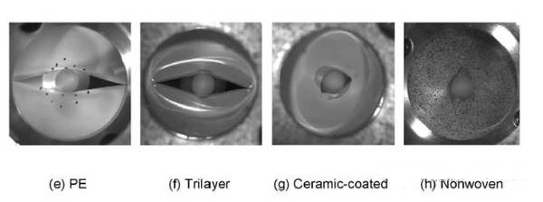 穿刺強(qiáng)度實驗發(fā)現(xiàn),干法工藝制備的PE隔膜和三層復(fù)合隔膜會在沿著縱向的方向上出現(xiàn)一個較長的裂縫,而對于濕法工藝和無紡布工藝隔膜,失效多數(shù)只出現(xiàn)在局部,并且呈現(xiàn)圓形破口。