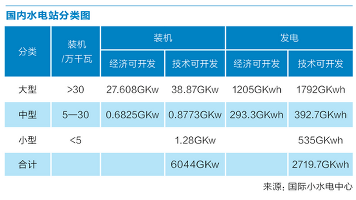 電力行業(yè)對(duì)水電規(guī)模以單站裝機(jī)容量大小界定,單站容量大于30萬(wàn)千瓦為大型水電,單站容量5萬(wàn)—30萬(wàn)千瓦為中型水電,單站容量5萬(wàn)千瓦以下的則為小型水電。