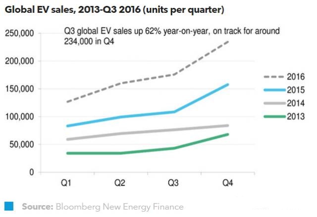 中國(guó)儲(chǔ)能網(wǎng)訊:2016年第三季度全球電動(dòng)汽車銷量同比增長(zhǎng)62%,其中中國(guó)和北美市場(chǎng)的增長(zhǎng)最為顯著。憑借著純電動(dòng)車的熱賣,中國(guó)市場(chǎng)的環(huán)比增長(zhǎng)再次領(lǐng)先。北美同比增長(zhǎng)則為62%,縮短了與歐洲的距離。我們認(rèn)為到2016年底,電動(dòng)車年度銷售量將達(dá)到70萬(wàn)臺(tái)左右,交出一份出色的答卷。鋰離子電池的需求量快速上升,2016年第三季度的數(shù)字顯示,同比增長(zhǎng)為105%。