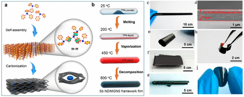 圖1 限域超組裝氣相沉積法中金屬-碳骨架復(fù)合膜形成機制:(a)和合成路線(b);復(fù)合膜掃描電鏡照片(d)及石英管中復(fù)合膜(c)和復(fù)合膜在不同彎曲和加工處理時的光學(xué)照片(e-i)