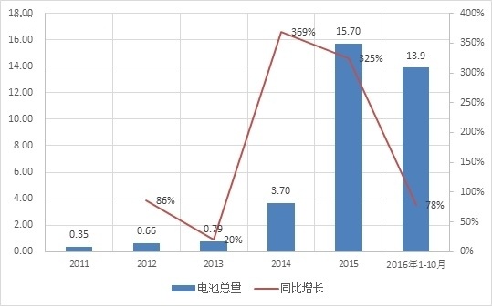 2011年-2016年動(dòng)力電池出貨量變化 (單位:Gwh)