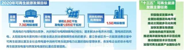 到2020年,各類可再生能源供熱和民用燃料總計可替代化石能源約1.5億噸標(biāo)準(zhǔn)煤,一些地區(qū)工業(yè)、建筑、交通等領(lǐng)域增量或存量的能源消費中將爭取率先實現(xiàn)高比例可再生能源應(yīng)用,并形成以可再生能源為主、分布式電源多元互補的較為完善的新能源微電網(wǎng)技術(shù)體系和管理體制,為加快推動可再生能源利用、替代化石能源消費打下堅實基礎(chǔ)。