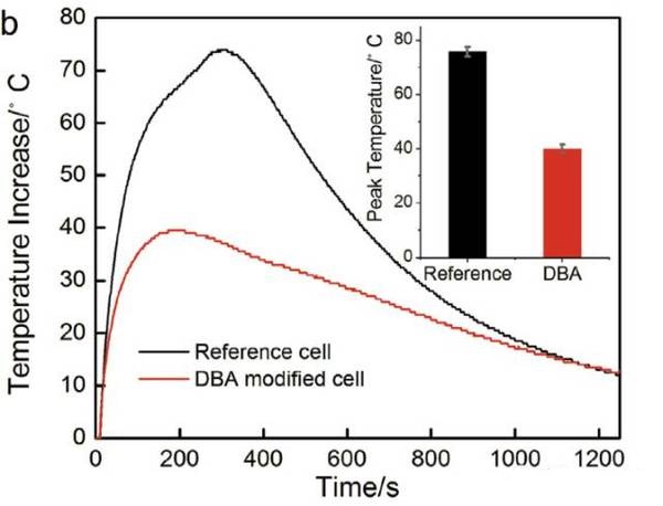 試驗(yàn)中采用了LIR-2450扣式電池進(jìn)行了測試,在針刺試驗(yàn)中,添加DBA的實(shí)驗(yàn)組電池溫升為40攝氏度,而對照組試驗(yàn)電池的溫升則達(dá)到了75攝氏度,通過添加DBA使得在機(jī)械濫用導(dǎo)致的熱失控中電池溫升降低了50%左右。通過計(jì)算可以發(fā)現(xiàn),實(shí)驗(yàn)組電池在熱失控中釋放的熱量為0.15Wh,而對照組電池在熱失控中則釋放了0.23Wh的熱量,通過在電池中添加4%的DBA使得電池在熱失控中電池產(chǎn)熱降低了1/3左右。