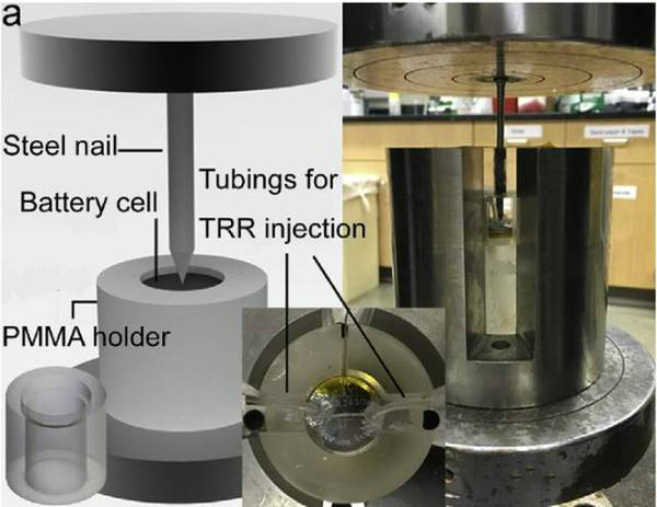 因此,如何避免鋰離子電池發(fā)生熱失控和如何抑制熱失控在電池組內(nèi)部蔓延就成為了人們關(guān)注的焦點(diǎn),例如在前一篇文章中,我們就介紹了一種填充在電池組內(nèi)部,用于抑制熱失控電池組內(nèi)蔓延的相變復(fù)合材料PCC。而今天要給大家介紹的是一種添加在電池內(nèi)的熱失控抑制劑,該材料的主要作用是當(dāng)鋰離子電池在發(fā)生機(jī)械濫用的情況下,能夠在電池內(nèi)部及時(shí)釋放,從而抑制熱失控的發(fā)展。研究顯示,通過在電池內(nèi)添加4%的抑制劑,就可以將電池在穿刺實(shí)驗(yàn)中的最高溫度降低50%,而且該材料對電池的循環(huán)性能影響微乎其微,該研究成果最近由加州大學(xué)圣地亞哥分校的Yang Shi等人發(fā)表在JPS期刊上。