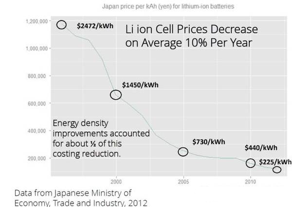 中國(guó)儲(chǔ)能網(wǎng)訊:根據(jù)日本經(jīng)濟(jì)產(chǎn)業(yè)省的數(shù)據(jù),鋰電池的成本在過(guò)去20年里每年平均下降10%。從上個(gè)世紀(jì)90年代中的2472美元/千瓦時(shí)降至2010年的440美元/千瓦時(shí),目前成本降至200-300美元/千瓦時(shí)。那么,有沒(méi)有可能鋰電池的成本在較短的時(shí)間降至100美元/千瓦時(shí)?如果達(dá)到這個(gè)水平,能源世界勢(shì)將面臨新的革命。