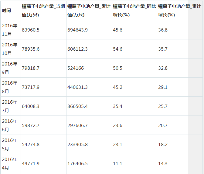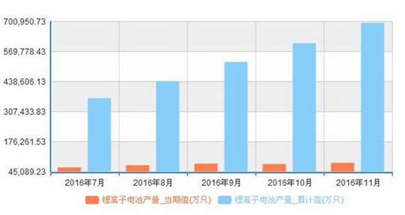 以下為2015年11月至2016年11月我國鋰離子電池產(chǎn)量統(tǒng)計: