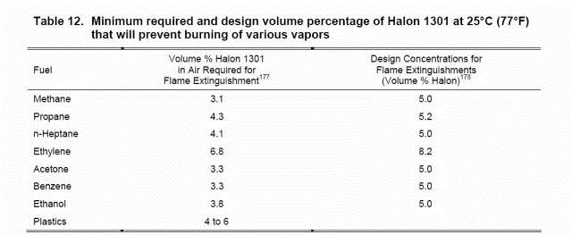 Table 12 shows the average percent by volume of agent in air required to extinguish a flame. Italso shows the design concentrations for a total flooding system required to suppress flamingcombustion. The design concentrations for flame extinguishment include an added safety factorover the required