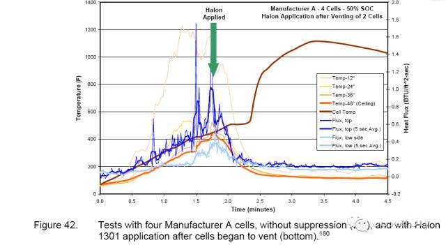 這與火焰的抑制是完全一致的。腔室的溫度和熱通量對于測試的持續(xù)時間仍然很低。需要注意的是哈龍1301的應(yīng)用程序沒有冷卻細(xì)胞(圖42)。單個細(xì)胞和細(xì)胞排氣熱失控繼續(xù)應(yīng)用于哈龍1301后出現(xiàn)。從指數(shù)的哈龍1301的測試所有細(xì)胞的檢查表明,他們已經(jīng)排出。然而,鹵化烴1301目前,這種方法并沒有導(dǎo)致。指數(shù)總結(jié)哈龍1301在控制鋰離子燃燒細(xì)胞非常有效。