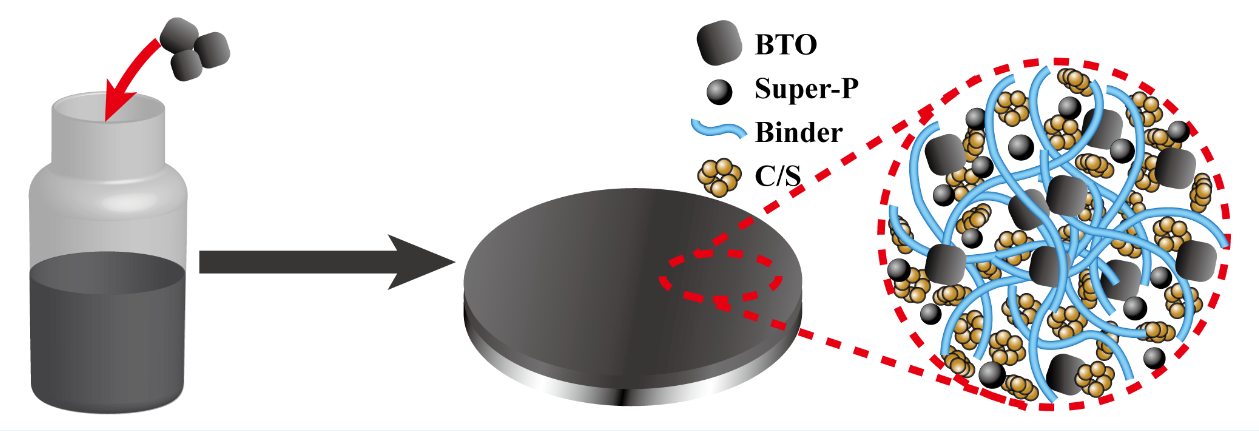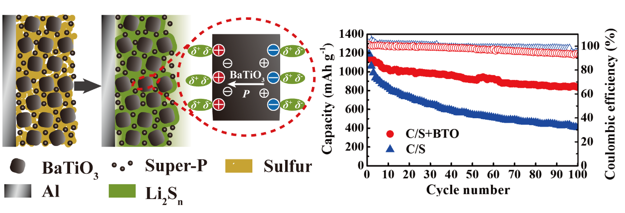 鋰硫電池理論能量密度高達(dá)2600 Wh kg-1,是未來最具應(yīng)用前景的新型二次電池之一。但其充放電過程中的中間產(chǎn)物在電解液中具有一定的溶解性,易擴散到負(fù)極,并與鋰金屬反應(yīng),造成正極活性物質(zhì)損失,并腐蝕鋰負(fù)極,嚴(yán)重影響了電池的循環(huán)穩(wěn)定性,成為制約其商業(yè)化應(yīng)用最關(guān)鍵問題。該工作借鑒了鐵電材料與光催化領(lǐng)域的最新研究進(jìn)展,簡單地將鐵電材料BaTiO3作為添加劑加入到正極漿料之中,利用納米BaTiO3自發(fā)極化特性吸附同樣為極性的中間產(chǎn)物,顯著提升鋰硫電池的循環(huán)穩(wěn)定性。比其他思路,該方法操作簡單,可無縫銜接到目前鋰電池電極制造工藝之中,適合工業(yè)化生產(chǎn)。