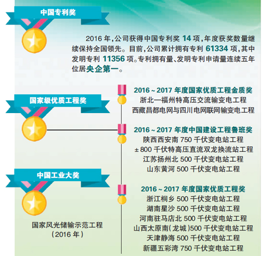 該公司科技創(chuàng)新取得佳績。公司組織申報的青藏電力聯(lián)網(wǎng)工程、電網(wǎng)雷擊防護關鍵技術與應用、預防交直流混聯(lián)電網(wǎng)大面積停電的快速防控與故障隔離技術及應用等3項成果榮獲國家科學技術進步二等獎,大功率特種電源的多時間尺度精確控制技術及其系列產(chǎn)品開發(fā)和特大型水輪機控制系統(tǒng)關鍵技術、成套裝備與產(chǎn)業(yè)化等2項參與成果獲國家科學技術進步二等獎。公司組織申報的12項輸變電工程全部榮獲國家級優(yōu)質(zhì)工程獎,創(chuàng)歷年來公司電網(wǎng)建設優(yōu)質(zhì)工程創(chuàng)建管理的最好成績。12月11日,國家風光儲輸示范工程榮獲我國工業(yè)領域最高獎項——第四屆中國工業(yè)大獎。這是繼1000千伏晉東南—南陽—荊門特高壓交流試驗示范工程和青藏電力聯(lián)網(wǎng)工程后,公司連續(xù)第三次獲此殊榮。公司獲得中國專利獎14項,年度獲獎數(shù)量繼續(xù)保持全國領先。