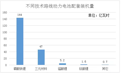 今年前11月,磷酸鐵鋰電池為主力配套電池,配套量達144億瓦時,占比72%;三元材料電池占比配套量為磷酸鐵鋰電池的1/3,為24%;錳酸鋰配套量為5.2億瓦時,占比近3%,其它占比均不到1%。