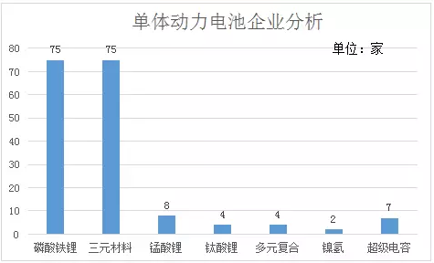 140家單體配套企業(yè)中,磷酸鐵鋰電池配套企業(yè)75家,三元電池配套企業(yè)75家,錳酸鋰配套企業(yè)8家,鈦酸鋰配套企業(yè)4家,多元復(fù)合電池配套企業(yè)4家,鎳氫電池配套企業(yè)2家,超級電容配套企業(yè)7家。